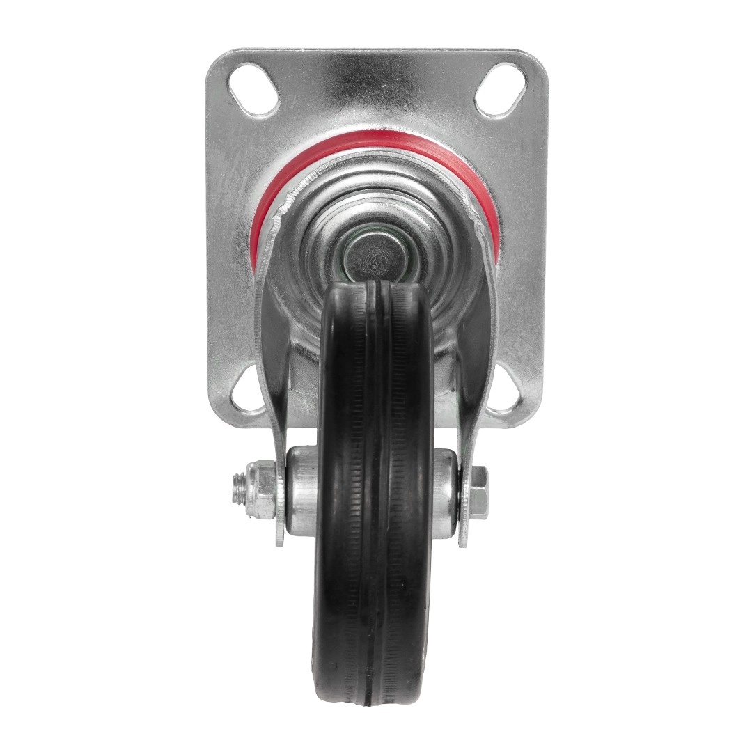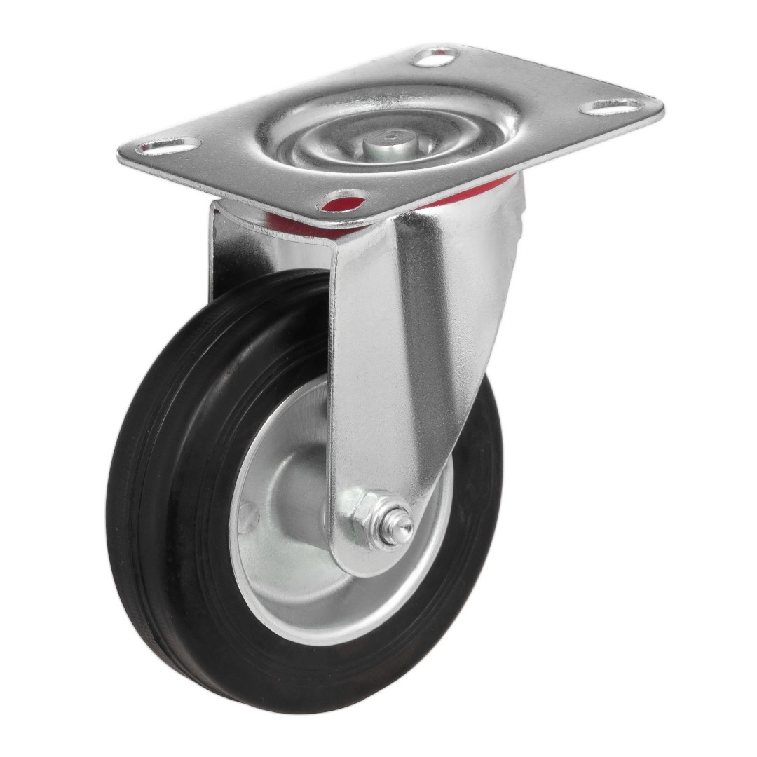 Колесо поворотное 4001-100, диаметр 100 мм., грузоподъемность 70кг., Колеса из черной литой резины, центр из двух гальванизированных дисков из штампованной стали. Роликовый (игольчатый) подшипник расположен в углублении, выдавленном под прессом, и содержит цилиндрические ролики подшипника. Кронштейн изготовлен прессованием из листовой стали. В поворотном узле двухрядный шарикоподшипник. Возможно применение на относительно грубых полах складов, заводов, производственных и строительных площадках. Данные колеса можно использовать на неровных поверхностях, во влажной окружающей среде и использовании вне помещения, не рекомендуется применять в среде с органическими растворителями, хлорированными веществами, гидрокарбонатами и минеральными маслами. Температура эксплуатации от -20 до +70С.
