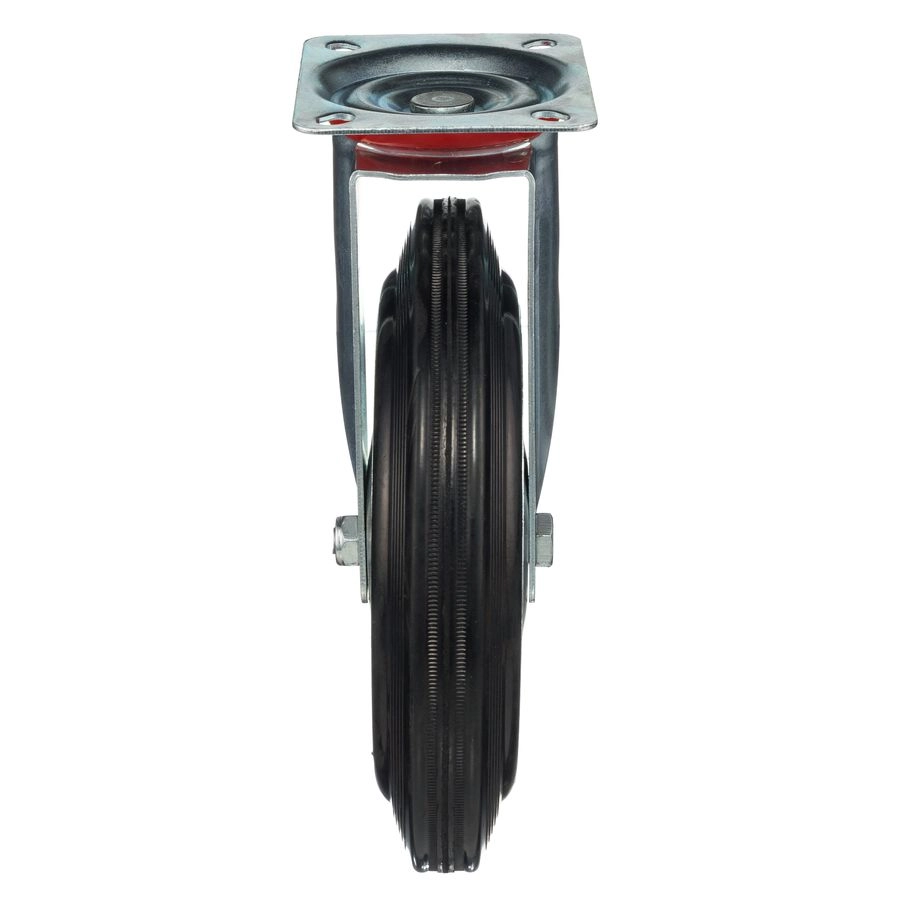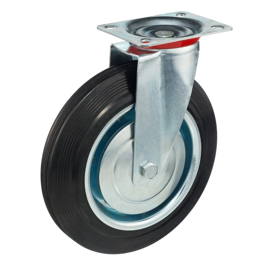 Колесо поворотное 4001-250, диаметр 250мм., грузоподъемность 210кг. Колеса из черной литой резины, центр из двух гальванизированных дисков из штампованной стали. Роликовый (игольчатый) подшипник расположен в углублении, выдавленном под прессом, и содержит цилиндрические ролики подшипника. Кронштейн изготовлен прессованием из листовой стали. В поворотном узле двухрядный шарикоподшипник. Возможно применение на относительно грубых полах складов, заводов, производственных и строительных площадках. Данные колеса можно использовать на неровных поверхностях, во влажной окружающей среде и использовании вне помещения, не рекомендуется применять в среде с органическими растворителями, хлорированными веществами, гидрокарбонатами и минеральными маслами. Температура эксплуатации от -20 до +70С.