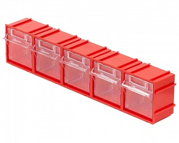Комплект из 5-ти коробов откидных Стелла-техник F-70-1-К5 (70х60х76мм.) красный, прозрачный служит для хранения мелкоштучных предметов. Данные короба с помощью специальных пазов соединяются друг с другом по всем четырем сторонам, благодаря чему, пользователь может выстроить систему хранения по желаемым ему габаритным размерам. Внутренние ячейки короба не подвержены случайному опрокидыванию. Откидная ячейка обеспечивают быстрый доступ к необходимым предметам. В случае необходимости полного высыпания или наполнения внутренние ячейки легко извлекается. Полезный внутренний размер ячеек 56х43х47мм. Специальный пластик, из которого выполнен короб, выдерживает значительные нагрузки и обладает оптимальной эластичностью. На задней стенке короба присутствуют отверстия для крепления, через которые можно легко прикрепить к стене, как отдельно каждый, так и целый собранный набор из коробов, любого количества. Обзорность содержимого сквозь прозрачные внутренние ячейки, наличие отсека для информационных бирок, легкое извлечение внутреннего короба для опустошения и наполнения, все это является неоспоримым преимуществом откидных коробов серии F. Температура эксплуатации от -10 до + 70С.