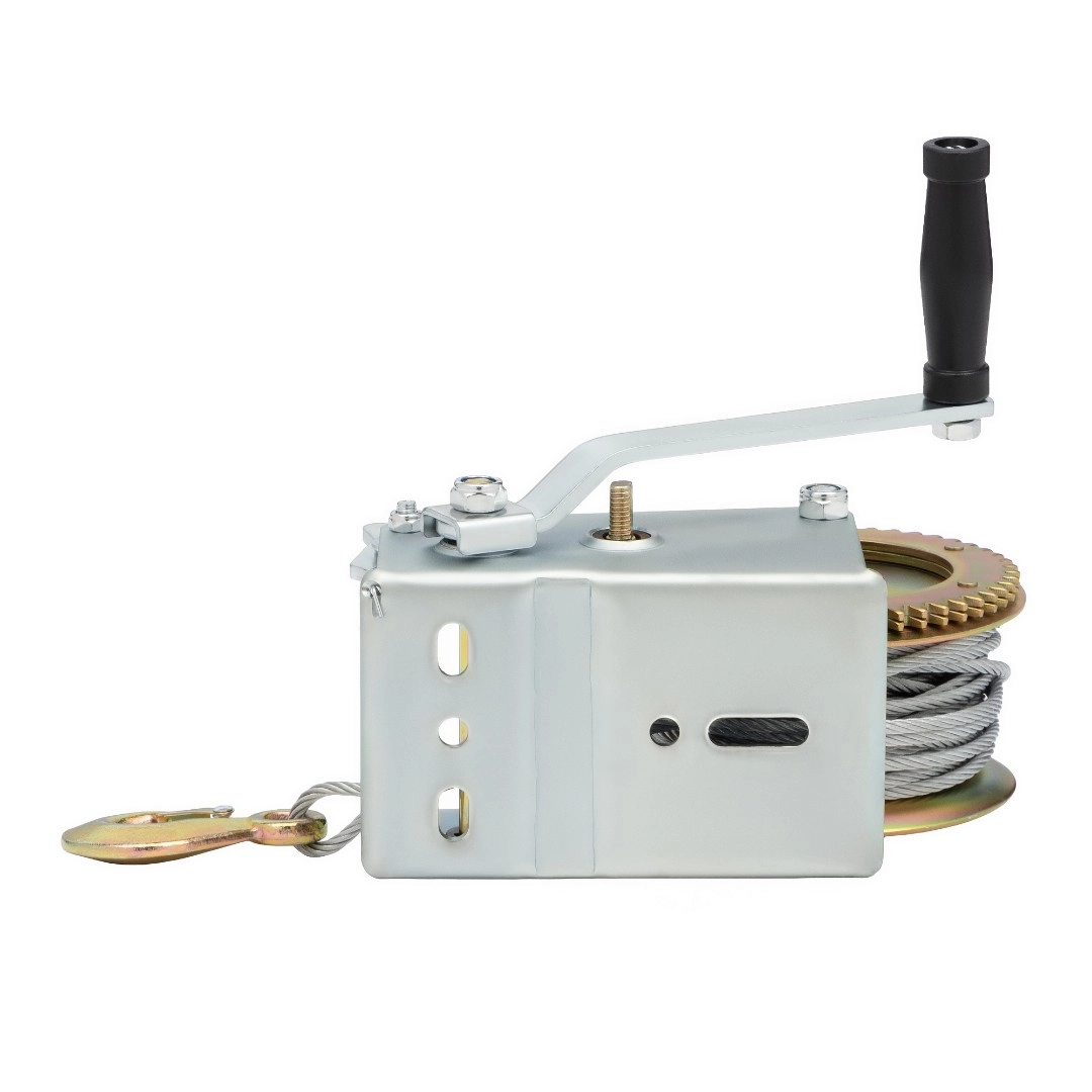 Барабанная ручная лебедка модели WH 16-20 обеспечивает тяговое усилие до 700кг., при длине троса 20м. Ее применяют для разгрузки товаров в магазинах и на складах, в строительстве, на производстве, и в быту. Стальной трос снабжен крюком с защелкой, усиление троса 0,7т., диаметр троса 5мм., длина троса 20м. Подъем осуществляется за счет вращения ручки с пластиковой рукояткой. При отпущенной ручке автоматически срабатывает тормоз, что позволяет зафиксировать груз. Направление хода вперёд-назад. Тип передачи шестеренчатая (1 скорость). Габариты 170x200x150мм., вес 5кг.