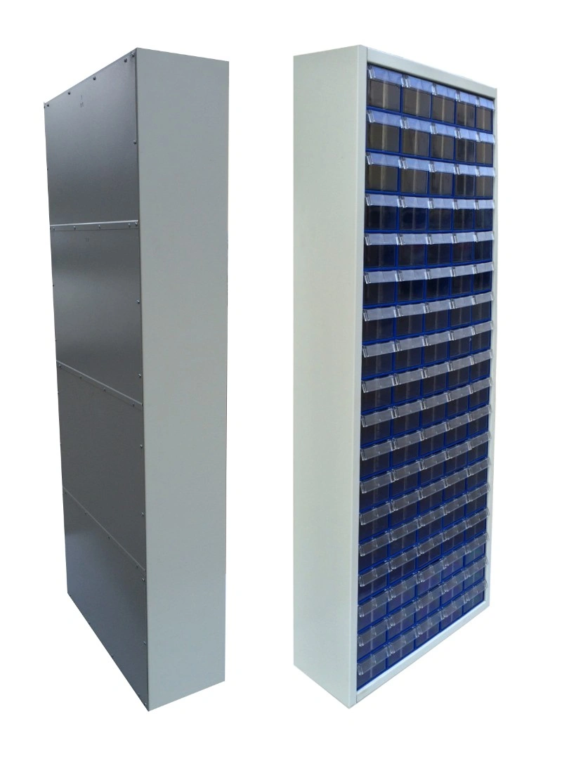 Шкаф металлический в сборе Стелла-техник С-2-90 на 90 коробов отлично впишется в интерьер любого склада, подсобного или торгового и офисного помещения. Цвет шкафа светло-серый. Цвет коробов С-2 синий, прозрачный. Металлический каркас шкафа востребован в первую очередь на предприятиях и организациях, где по определенным нормам и стандартам, принятом в данном учреждении, запрещено использование шкафа из ламинированного ДСП. Главная особенность шкафа – объединение большого количества коробов с определенным типовым размером. Изделие допускает одновременное применение 90 пластиковых складских контейнеров. Прозрачные внутренние короба С-2 позволяют легко находить содержимое и контролировать полноту наполнения. Внутренний короб легко вынимается для опустошения или наполнения, по принципу спичечного коробка. Он имеет рельефную структуру днища и усиленные толстые стенки. За счет этого, изделие справляются с высокими эксплуатационными нагрузками. Внутренние полезные размеры выдвижного короба: 220х123х80мм. Возможность установки одной продольной перегородки (артикул: С-2 продольная) или до трех поперечных (артикул: С-2 поперечная). Продольная и поперечная перегородки одновременно не устанавливаются. Перегородки в комплект короба не входят и поставляются отдельно. Рекомендуемая нагрузка на короб, в составе шкафа, не более 3кг.