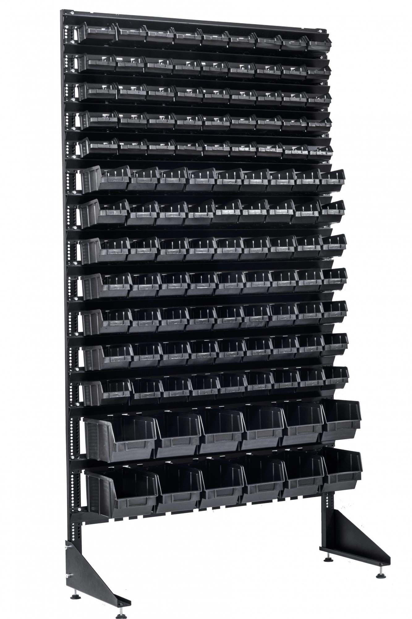 Конструкция данного оборудования, позволяет комбинировать ящиками разных размеров. Перфорация на стойке, позволяет менять шаг в зависимости от размера лотка. Траверсы крепятся на стойку болтами М6, (болты в комплекте).