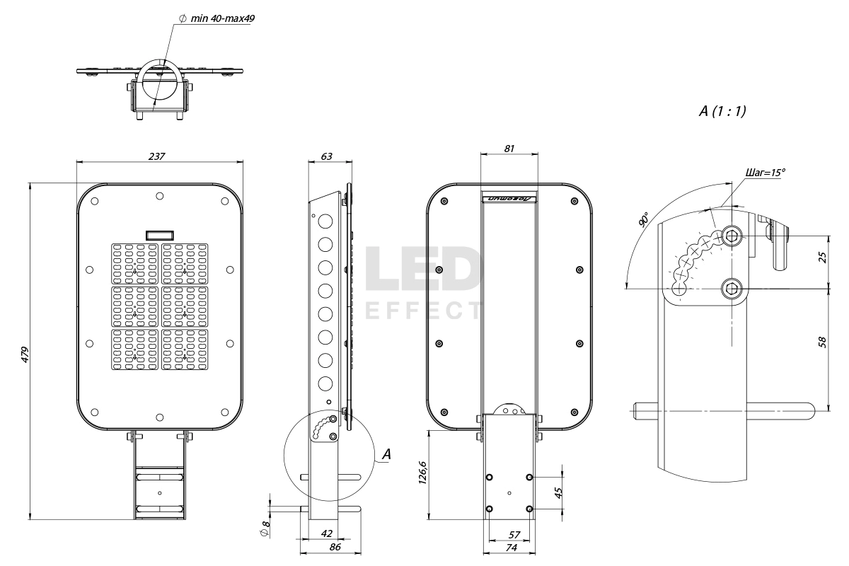 - Простой монтаж на стандартные опоры уличного освещения, d до 48 мм;